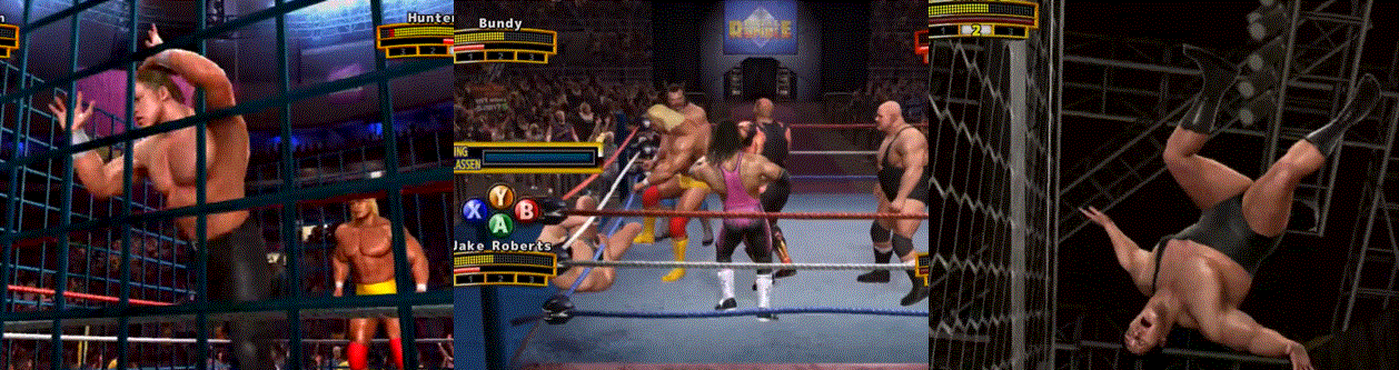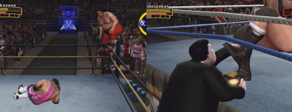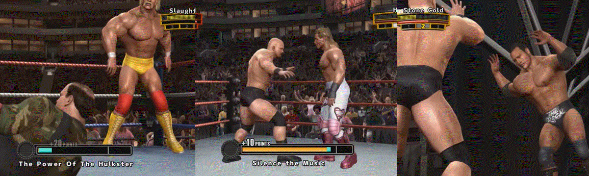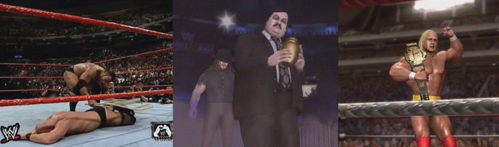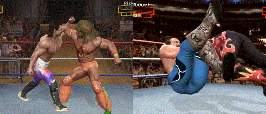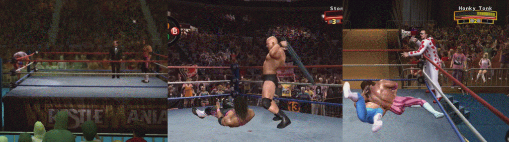 The number of arenas on offer isn’t exactly much to shout about either. There’s very little variety on offer as you can only fight in WrestleMania arenas; there is a Royal Rumble arena, however, (and ironically you can only ever fight a Royal Rumble match in this arena) but there’s no Raw, SmackDown!, or other pay-per-view arenas on offer. The crowds are as sub-standard as ever, sporting signs and attire tied to their favourite superstars and parting to allow you to fight over the barricade (though essentially acting as barriers to keep you enclosed), but entrances have been a bit neutered. The game does offer the old-school gondola entrances, which is kind of cool, and recreates the old-school name plates and presentation of the pre- and early-“Attitude Era” of the WWE. Unfortunately, however, the presentation does take a bit of getting used to; the camera is very zoomed in, meaning that your Legends take up a lot of screen space and this can make it a little difficult to be fully aware of your surroundings. The camera is prone to wild swings and odd positioning, which is very annoying, and there’s a noticeable delay between button presses and executing grapples, making for a much more deliberate and slower pace to the game. Though I eventually learned to live with these niggling problems, it did take me a while to adjust to the presentation and gameplay style of the game.