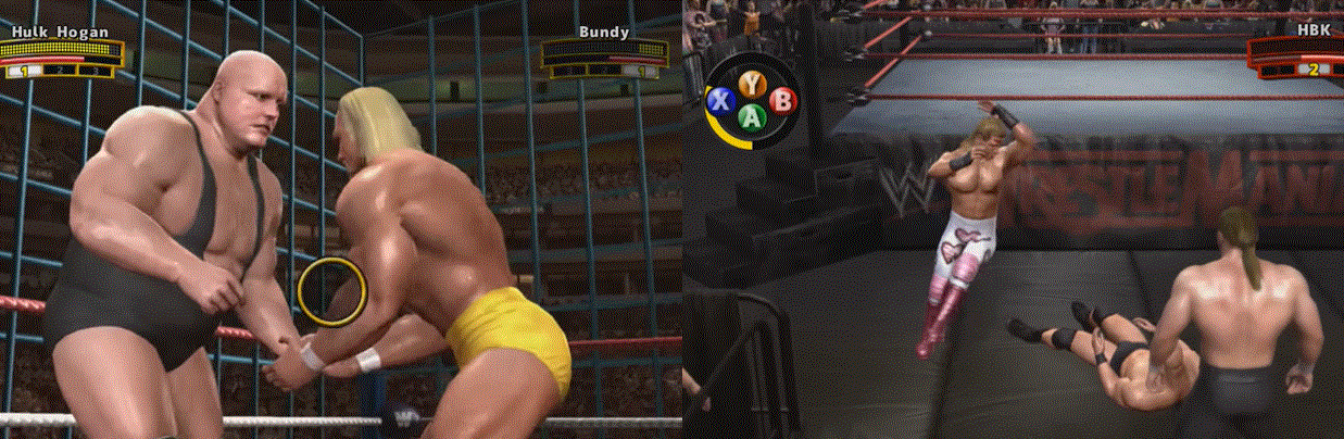 You can throw a strike at your opponent with X; land a few in quick succession to perform a simple combo or hold X to charge up a powerful strike, with both knocking them to the mat and leaving them prone for a leg or elbow drop or other ground-based offense. Grappling is performed with A; again, you can either tap it for a quick, weak grapple, or hold it for a stronger grapple, and use a directional input in conjunction with A to perform different moves (though your move pool is quite limited). As you attack and mix up your offense, you’ll build up a “Chain Meter”; as it reaches three different levels, you’ll gain access to more powerful grapples, with your finisher being unlocked at Level 3 and performed by pressing X and A together. Successfully landing attacks drains your opponent’s health meter and weakens them for either a pin or submission; submission moves are generally locked in when the opponent’s on the mat and see you mashing buttons to wear your opponent down, or you can pin them with B. If either of these things happen to you, you’ll need to mash buttons or full a circular meter to hit a small target in order to stave of the attack or kick out of the pin attempt.