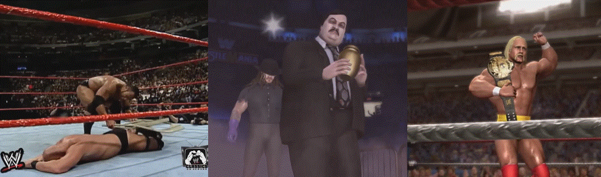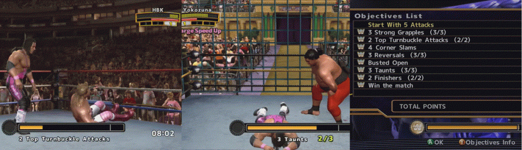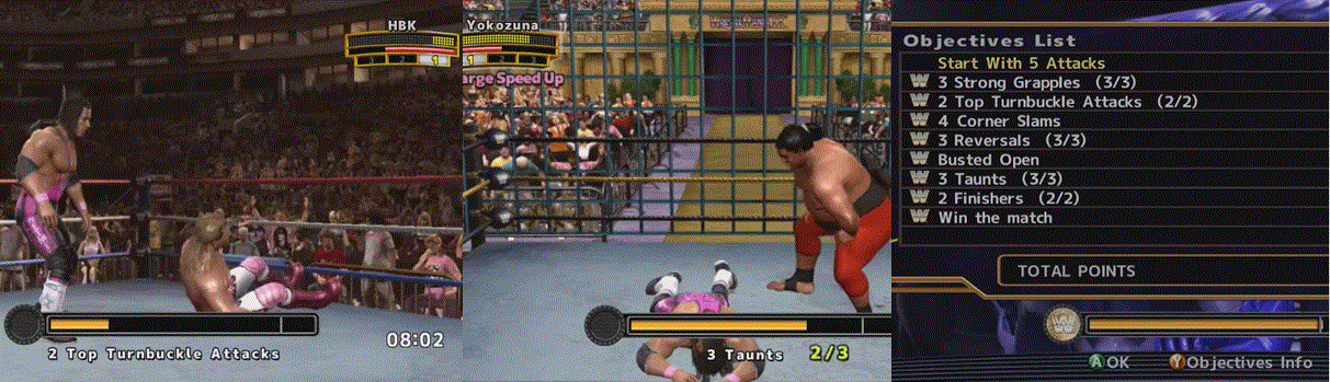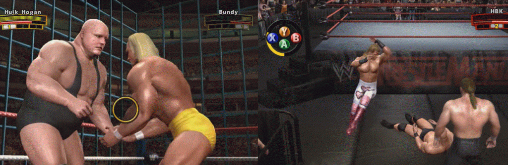 Speaking of which, you’ll be given three single-player options here: “Relive” (where you recreate specific WrestleMania matches), “Rewrite” (where you tackle other WrestleMania matches from the perspective of the historical loser), and “Redefine” (which features unique “dream matches”). Each of these matches is proceeded by a short hype package that features clips from real-life wrestlers and the matches and feud between the competitors, and you’ll be given a series of optional objectives to fulfil in order to earn points. These range from performing a certain number of attacks, grapples, counters, and finishers, winning the match, performing taunts, winning pre-match sequences, and more specific environmental situations (such as winning Chain Grapple sequences, slamming your opponent through an announce table, or grappling up near the entrance). Earning points fills a meter and, once it fills high enough, you’ll earn a medal that will award you with unlockable match types, attires, and more. There’s nothing to gain from playing WrestleMania Tour on anything other than the easiest difficulty, with the computer’s abilities completely neutered in your favour, beyond personal pride so you may as well manipulate the game’s settings to make things easier for you. This mode is also probably the best part of the game as it lets you recreate some iconic WrestleMania moments and matches, and meeting the objectives can be fun, but things quickly get quite frustrating if you’re trying to earn all the medals and monotony sets in quite fast as there’s not much variety in terms of the match types (there are no multi-man matches in this mode, for example) beyond the odd cage or ladder match and you can completely ignore the objectives if you like since winning is all that really matters.