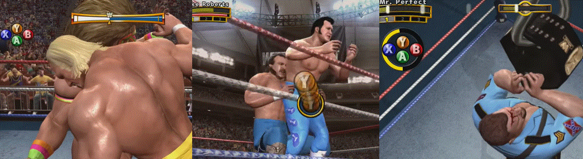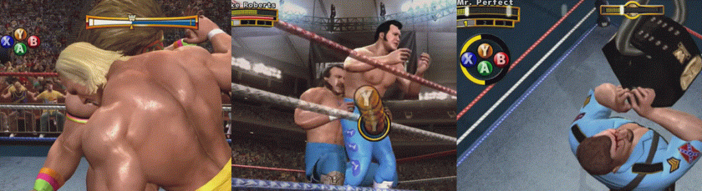 Enemies and Bosses: Being a wrestling title, every single in-game Legend is potentially your enemy; however, as mentioned, it’s not really necessary to play as or fight against each of the game’s roster in order to learn their strengths and weaknesses. Once you’ve played as and against a couple of the Legends, you’ve pretty much experienced all of the variety the game’s conflicts have to offer; your biggest hurdle will be getting the timing of the weird reversal system down, but you can circumnavigate this by just attacking your opponent head-on with strikes and landing strong grapples as and when they unlock. Guys like Bam Bam Bigelow might look big and intimidating, and the Honky Tonk Man might be the ultimate opportunist, but it’s not like you have to worry about character-specific abilities so what works against one will work against all as long as you can hit the QTE prompts when your opponent does get the drop on you.