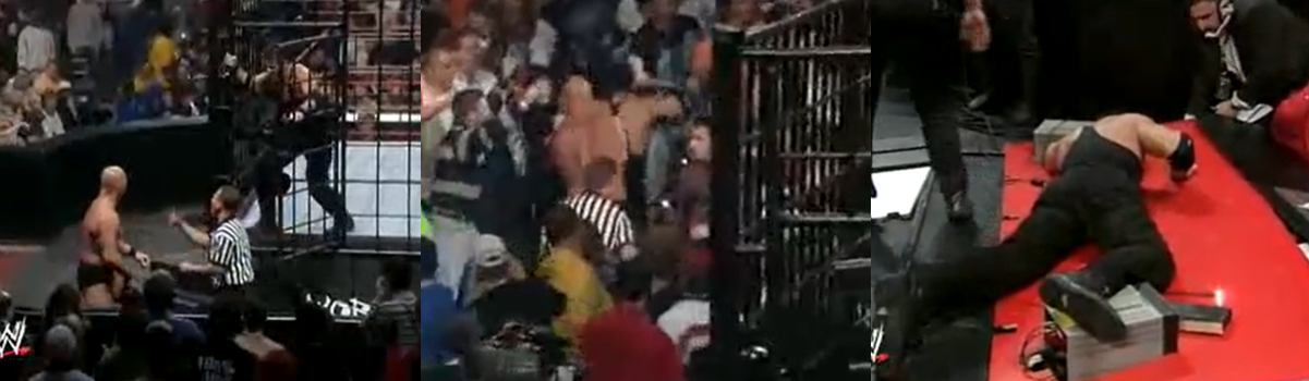 Of course, Austin was practically frothing at the mouth as McMahon approached the cage, desperate for his hated rival to get into the ring, but McMahon purposely made him wait by loitering at ringside and taking his sweet time to enter. Naturally, this whipped the crowd into an uproar and incensed Austin, who chased the chairman around the ringside area before the two get into a bit of a slap fight on the cage wall. After toying with each other for a bit, Austin took a tumble to the floor and seemed to twist his ankle. Delighted, McMahon left the cage to try and capitalise on Austin’s injury, only to walk right into a trap! Austin decked McMahon with a clothesline and pummelled him across the announce table, slamming him into the steel cage, and then choking him out with a piece of extension cord. Firmly in control, Austin dumped McMahon over the barricade and put a beating on him in the crowd, refuelling with a cheeky brewski before running McMahon into the steel stairs. McMahon mounted a comeback, however, with a cheap shot and then lured Austin into the crowd for a brawl. McMahon tried to escape amidst the sea of people, but Austin caught him and dragged him back to ringside, slamming him into the barricade and the cage bars over and over, yanking the boss down from the cage when he tried to climb to safety and stomping right on his crotch. When McMahon tried one more time to climb into the ring and escape Austin’s wrath, Austin followed him and, after a bit of back and forth, knocked Vince from the cage and sent him crashing through the Spanish announce table!