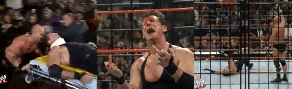 Michael Cole and Jerry Lawler prattled on about how shocked and concerned they were at how quickly the match had turned brutal, and the doctors and referees rushed down to ringside to strap Vince onto a stretcher; when Howard Finkel tried to announce Austin as the winner by default (despite the match not having officially started yet), Austin cut him off and demanded that the match continue. Austin commandeered the stretcher and drove the helpless McMahon into the steel cage, pummelling him with the back board, and finally tossing him into the ring so the match can officially begin. The minute the bell rang, Austin wrecked McMahon with a clothesline, ripped off his neck brace, and decimated the defenceless chairman with repeated second-rope elbow drops. Seemingly satisfied, Austin went to leave via the door but McMahon goaded his rival back into the ring by flipping him the bird, receiving Austin’s trademark mudhole stomps in the corner for his troubles. However, McMahon managed to turn things around with a low blow and tried to clamber out of the cage, but Austin recovered fast enough to stop him and fling him back into the ring from the top of the cage wall. The crowd was loving it as Austin rammed McMahon into the cage wall over and over, busting him open and leaving him a bloody mess, but Vince continued to flip Austin off and stop him from leaving the ring. Incensed, Austin returned to the ring and left the chairman a bloody, crumpled heap.