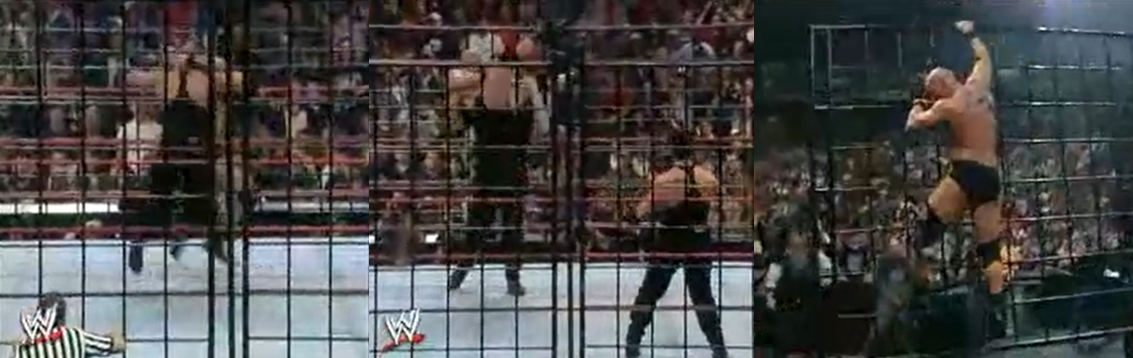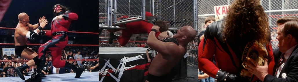 The Match: I think Kane said it best when he once stated that few people remember him winning the WWF Championship on this night thanks to the absolute war the Undertaker and Mankind enacted in the previous match! They didn’t even put a match between the Hell in a Cell and the main event to cool the audience down! I always remember it, though, since I was such a huge Kane fan back in the day and it saw him capture the WWF’s biggest prize from their most successful superstar, and all so soon after his initial debut. Proving that he isn’t some muscle-bound meathead, Kane sported a new attire for this match that completely covered every part of his body, making it seem all-but impossible that any trace of blood could be detected by the referee. Austin fearlessly stormed to the ring, his right arm heavily bandaged following a staph infection, and immediately hit his signature Lou Thesz Press and running elbow drop. Austin then clobbered Kane with the championship belt and removed a turnbuckle pad, though neither man could take advantage of the exposed bolt. Kane quickly ended Austin’s onslaught with some powerful strikes and chokes, shrugging off Austin’s blows but failing to hit the Tombstone Piledriver and being pushed outside. As they brawled around the ring, Austin bounced Kane’s face off the ring steps and the Hell in a Cell started to lower, much to J.R.’s anger. After whipping Austin into the steel steps, Kane ran him into the lowering cage and tried to crush Austin under the cell as it locked into position. Austin’s face bounced off the cage once more and J.R. quickly explained that the minor scratch on the Rattlesnake’s back wouldn’t count towards the match stipulation, allowing Kane’s decimation of the champion to continue. Austin began a comeback by ramming Kane’s head into the cell door, leading to Kane being lifted off the ground when the cage inexplicably rose! After a nasty tumble, Kane was repeatedly rammed into the security guardrail and walked up the entrance ramp, only for Austin to take an ugly back body drop to the concrete and a suplex on the rampway.