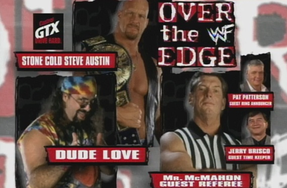 Austin and Dude Love kicked things off with a bit of a tie-up and Austin immediately showed the boss exactly what he thought of him by flipping him off after McMahon physically separated the two. Dude Love won the second tie-up and scored a two count off a clunky-looking shoulder block, which raised Austin’s ire as he accused the WWF Chairman of counting too fast on the pinfall. Austin and Dude Love tangled again and again the Dudester got the upper hand with a knee to the gut and a series of side headlock takedowns that earned him a couple of one counts, before Austin knocked him down with a back elbow and gave him a taste of his own medicine with a ground headlock of own. Austin brought Dude Love to his knees off an awkward Irish whip exchange and knocked Foley’s false teeth out; Austin then crushed them under his heel, but this distraction was enough for Foley to start beating on the champion in the corner. Austin exploded back into action with his patented Lou Thesz Press and then sent Dude Love tumbling over the top rope and to the outside with a clothesline, however Foley quickly regained the upper hand by tossing Austin into the steel steps at ringside. After rolling back into the ring, Austin fell victim to a Russian leg sweep, kicked out at two, and then found himself being choked and even chewed on in the ring corner! Despite Dude Love’s tenacity, Austin continued to kick out and even countered an Irish whip into a neckbreaker, which finally allowed him to build some momentum with a series of clotheslines. Austin even tied Foley up in the ring ropes after countering his signature nerve hold, the Mandible Claw (or should I say the “Love Handle”?) When the two resumed brawling around the announce tables, J.R. just about blew a gasket when Patterson announced that McMahon had changed the rules from a simple one-on-one contest to a no disqualification bout so that Dude Love could choke Austin with a piece of cable.
