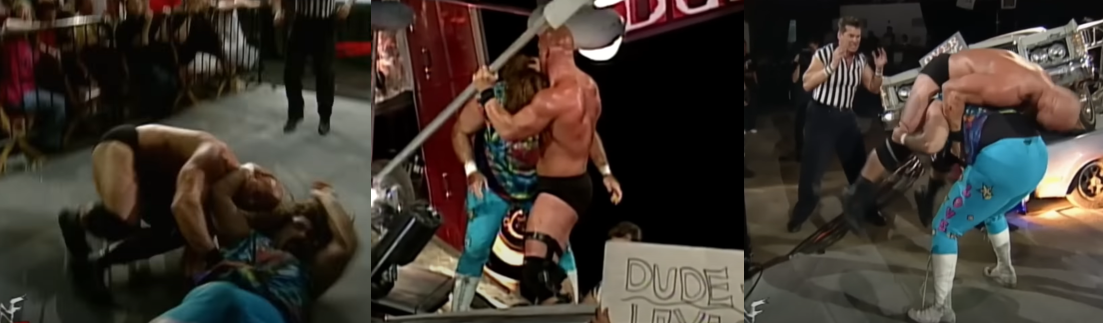 Austin and Dude Love battled on the outside, crashing into cars and concrete alike.