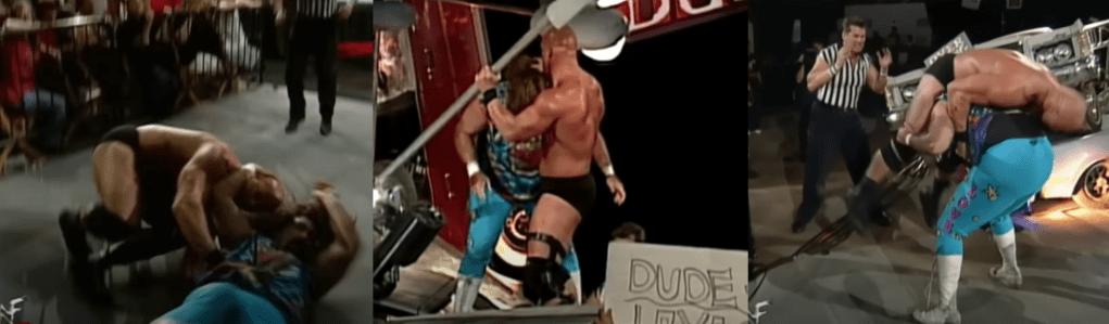 However, as much as Mick Foley thrived in a no disqualification environment, this stipulation also greatly favoured Austin; he launched Dude Love into the timekeeper’s table and hammered on his forehead with closed fists, bashed his head off the steel barricade, and then clotheslined him into the braying crowd. Back in the ring, Austin choked Dude Love on the bottom ropes but missed his trademark running rope knee attack, which allowed Foley to kick him to the outside with a baseball slide and then deliver a neckbreaker on the entrance ramp. Sensing the tide turning in favour of his flunky, McMahon frantically had Patterson announce that the match was falls count anywhere and dove in to count the pin, only for Austin to twice kick out at two. Austin answered back with another clothesline, kicking off a brawl around the cars dotted around the entrance ramp; Austin was launched into a windshield and had his head bashed off a car hood, but returned the favour with a flapjack into another car for a couple of close two counts. Austin then forced Dude Love onto a car roof and ended up taking a nasty tumble to the floor before Foley performed a sunset flip (which had to hurt him more as his tailbone bounced right on the concrete) for another near fall. Dude Love’s attempts to assault Austin with a metal pipe were thwarted by another flurry of punches from the champion, though Foley was able to counter a piledriver attempt into a back body drop. With Austin down and bloody from the challenger’s assault, Dude Love clambered onto a car and went for a diving elbow but ate nothing but concrete when the champion rolled out of harm’s way (though Foley was still able to get his shoulder up off the pin fall).