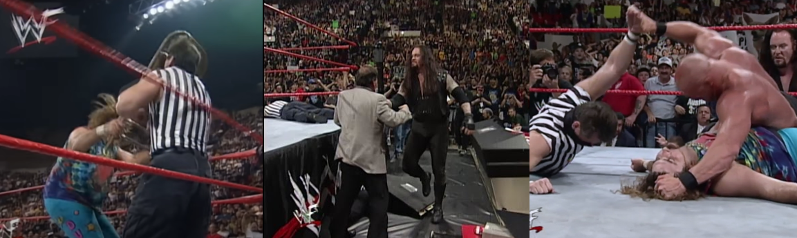 The Match: I became a wrestling fan at the end of the nineties, pretty much in the year 1999. Around then, my friends and I were playing the games on Nintendo 64 and PlayStation, and I would occasionally catch the odd episode or segment whenever I was at the house of my one friend with a Sky subscription. All this is to say that I came in at around the time of the Cactus Jack/Triple H feud and that, as much as my friend being a big Mick Foley fan, was enough to make Foley one of my favourite wrestlers at the time. As the years passed and I got my hands on more WWF content, I marvelled at his early matches in Japan and his bizarre promos as Mankind and his later Hell in a Cell antics, but it was his character work that really won me over and, to this day, I can’t help but watch the “Three Faces of Foley” segment from 1997 without chuckling. However, Dude Love is probably my least favourite of Foley’s three personas, simply because I enjoy his more extreme and surreal antics, but it’s definitely one of the most complex and peculiar since this is the façade he adopted to try and get in McMahon’s good graces, and which McMahon happily manipulated simply to try and get the WWF Championship off Steve Austin. Much of this is expressed at the start of this match, where Pat Patterson spent a couple of minutes bigging up both McMahon and Dude Love as they entered the ring and Foley (blue blazer and all) happily shook hands with the boss and his stooges, although their jovial mood was immediately soured right before the match started as the Undertaker came down to ringside to level the playing field.