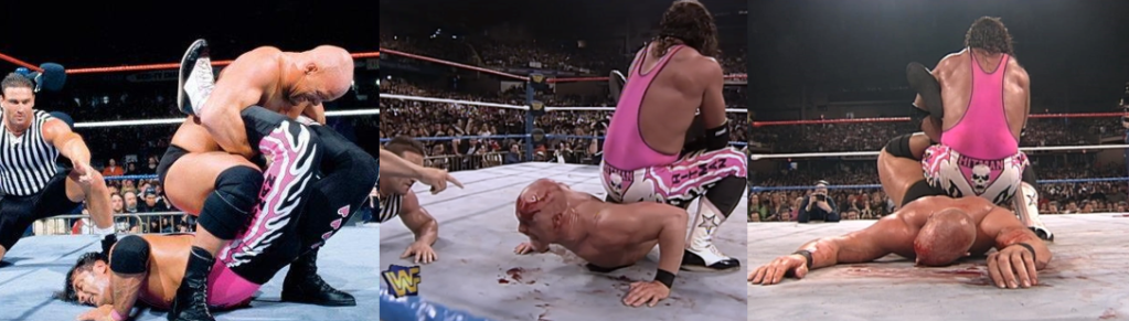 Once back at ringside, Austin whipped Bret knee-first into the ring steps, though Bret saved himself from further harm by kicking Austin’s knee out from under him. Once the two returned to the ring, Bret nailed a neckbreaker and an elbow drop from the second rope, before focusing his attack on Austin’s knee and leg in preparation for his patented Sharpshooter. With Austin grounded, Hart pounded, wrenched, and “dissected” Austin’s knee, causing the Rattlesnake to stumble and be spitefully kicked to the canvas whenever he fought to his feet. Even when Stone Cold hit a desperation Stone Cold Stunner to create some distance, it didn’t matter as Bret was right back up and soon had Austin’s legs tied around a ring post with a modified Figure Four Leglock! Despite the agony and the additional leverage afforded by the move, Austin refused to tap out to the hold, so the Hitman tossed his opponent into the ring and brought a steel chair and the ring bell into the match. Bret looped Austin’s bad leg into the chair and teased leaping off the top rope, looking to break Austin’s limb, only for Stone Cold to scramble to his feet and send Bret tumbling from the top rope with a chair shot to the head! Austin then continued the assault, whacking the chair over Bret’s spine and assaulting his foe with slams, whips, and suplexes, firmly targeting the Hitman’s back and landing a sneaky stomp to Bret’s balls to add insult to injury. Despite attacking Bret’s spine, Austin locked in a modified arm lock and seemingly forgot his leg, landing an elbow drop off the second rope and applying a Boston Crab. Despite the pressure, Bret hauled himself to the bottom rope to break the hold (something that shouldn’t have counted as this was a no disqualification match), so Austin tried to slap on the Sharpshooter. However, a thumb to the eye put a stop to that and, though Bret was soon launched to the outside, the Hitman continued his comeback by tossing Austin into the timekeeper’s table and busting him open with closed fists to the forehead.