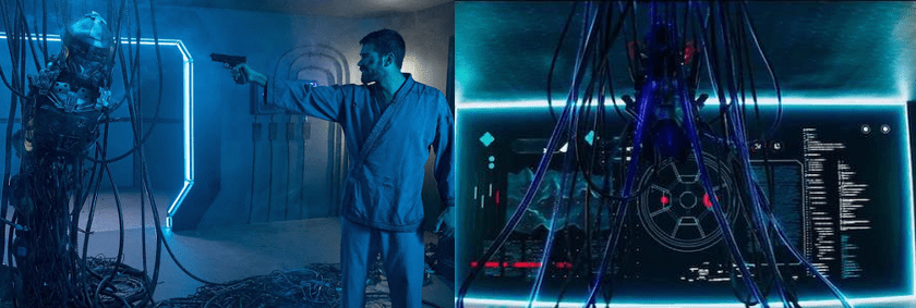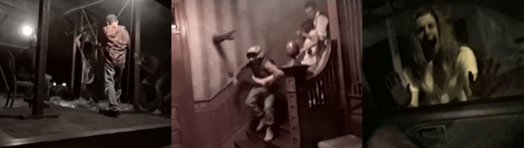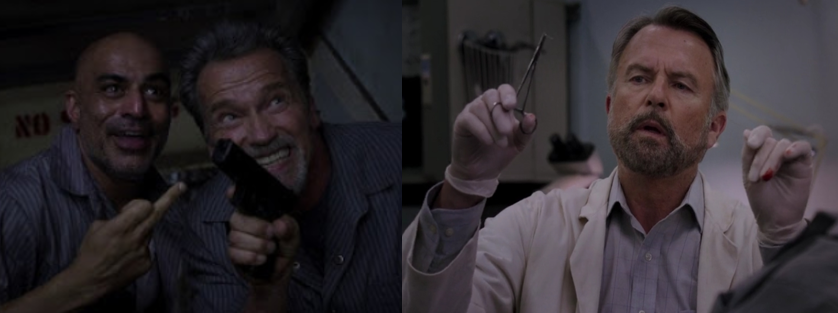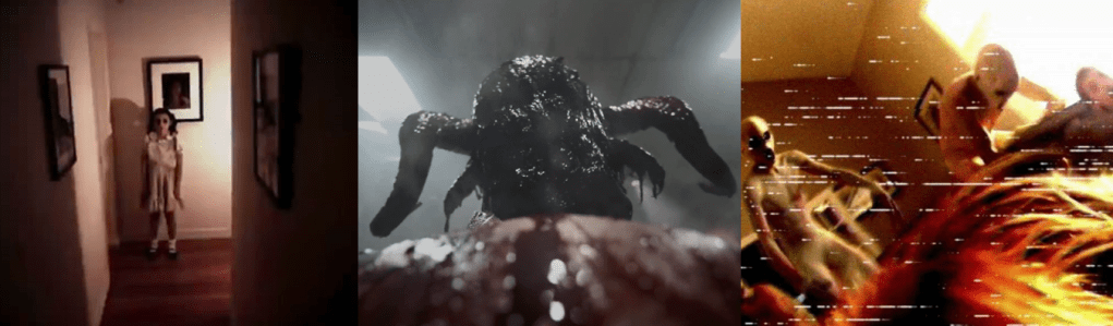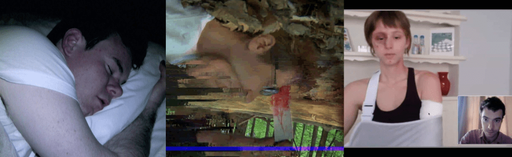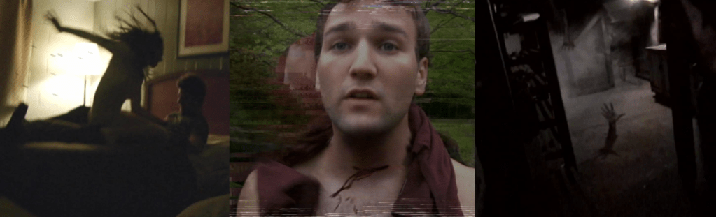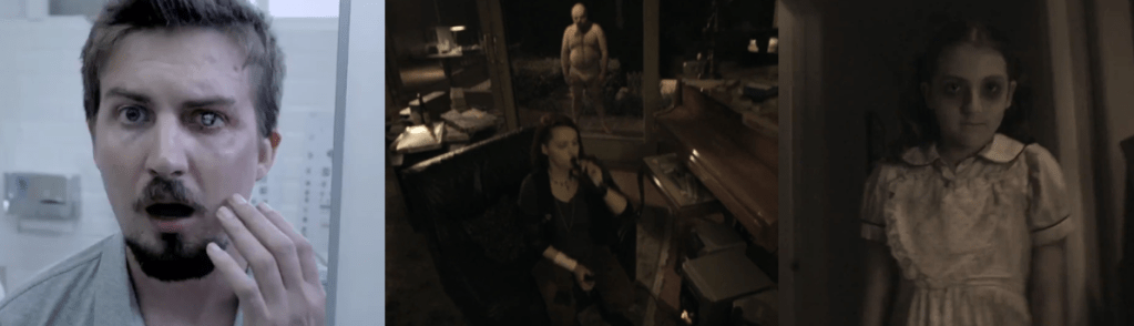 The first short story is “Phase I Clinical Trials” (Wingard), which puts a unique spin on the first-person, found footage concept by telling its story through an ocular implant inserted into Herman’s (ibid) head to replace his eye. Though disturbed to find that his every moment will be recorded throughout the trial period, Herman has little choice but to accept the restrictions that come from the implant, which Doctor Fleischer (John T. Woods) explains may also be accompanied by some “glitches”. After arriving home, Herman is spooked to find his game controller moved while he goes to make some tea, the kettle knocked from the stove when he leaves the kitchen, an invisible figure laying in his bed, and a bloodied phantom (Brian Udovich) who gives him a fright. The bloody man is joined by an unsettling child (Corrie Lynn Fitzpatrick) and the two terrify Herman, banging on his bathroom door and forcing him to sleep in the bathtub out of fear. The next day, he finds his house has been ransacked by the ghouls and is visited by Clarissa (Hughes), who received a similar implant to restore her hearing and, like Herman, has been tormented by ghosts ever since. Clarissa believes that removing the implants would simply take away their ability to perceive them and that the spirits grow stronger the more they are interacted with. Although she tries to use sex to take his attention away from the disturbing spirit of her uncle (John Karyus), who it’s implied assaulted her in the past, she’s dragged into his pool and, despite his best efforts to save her, is drowned by a particularly malevolent, invisible entity. Desperate to make the ghosts go away, Herman uses a razor to slice out his implant, however this only leaves him blind to their presence and allows them to easily overwhelm him and choke him to death with the same device.