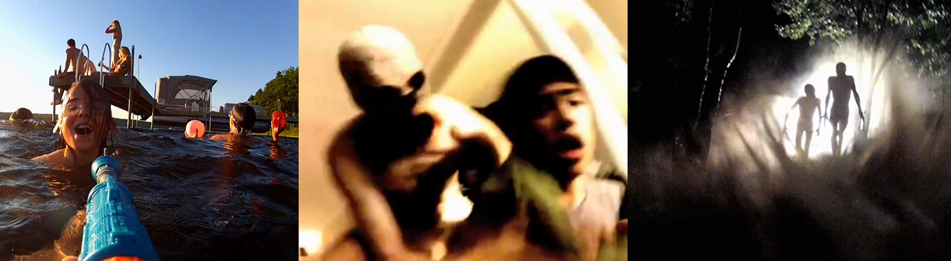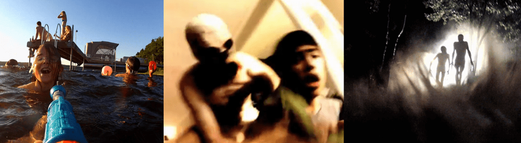 The film ends with another strong tale, “Slumber Part Alien Abduction” (Eisener), in which brothers Gary (Logan) and Randy (Cohen King) attach a miniature camera to their Yorkshire Terrier, Tank (Riley Eisener), to film their fun and games at their lakeside house. The boys delight in tormenting their older sister, Jen (Gracie), and her friends while their parents are away and are so caught up in their adolescent antics that they fail to notice a grey alien lurking beneath the lake and an ominous, deafening noise when they play a prank on Jen and her boyfriend, Zack (Jeremie Saunders), as they’re trying to have sex. Similarly, they also fail to pay much attention to a mysterious light show out over the lake but their tomfoolery is soon violently interrupted by the blaring noise, the power cutting out, and the presence of disturbing grey aliens outside their house. The monstrous beings grab the group, seal them in their sleeping bags, and try to drown them in the lake, with only Gary, Randy, Jen, and Tank surviving. Fleeing towards the strobing red and blue lights, they realise all too late that they’re running towards a trap rather than police assistance and both Jen and Randy are violently taken when Tank inadvertently attracts the aliens. Although Gary tries to flee with Tank up a ladder in the barn, they are ensnared by the aliens’ tractor beam and, in a distressing finale, Tank plummets to the ground and lies whimpering and dying as his family are abducted into the unknown.