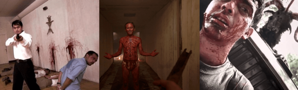 Easily my favourite of the film’s stories is “Safe Haven” (Tjahjanto and Evans), which depicts a film crew – comprised of interviewer Malik (Antara), his fiancée and producer Lena (Rashid), his best friend Adam (Albar), and cameraman Joni (Andrew Suleiman), all of whom are wired with hidden cameras and microphones – investigating a mysterious cult known as Paradise Gates, who are very secretive and mistrustful of outsiders. Lena is able to convince the cult’s leader, known only as “Father” (Epy Kusnandar), to permit them entrance to his compound so that they can produce a fair and accurate report that challenges the slander and rumours surrounding the cult. Once inside, they find bizarre symbols and effigies adorning the walls and that the cult worships Father and his teachings of immortality and providence; several children are present on the grounds, all of whom are heavily indoctrinated in Father’s teachings, and it’s heavily implied that the girls have been subjected to their leader’s sexual appetites. While Malik interviews Father, who vehemently defends his religion and his actions while condemning wider society for their ignorance, Lena reveals to Adam that he’s the father of her unborn child right before Father issues a command over the intercom that incites widespread suicides throughout the compound. In the chaos, Adam discovers a woman in the compound’s basement who has been strapped to an operating table and had her womb carved out, Father cuts Joni’s throat with a Stanley Knife for interrupting him, and Malik is executed on Father’s followers. Lena finds herself abducted by woman in surgical attire and, when Adam goes to rescue her, he’s rocked by an explosion, is disturbed to see a man crawling across the ceiling, and watches as the bloodstained Father explodes in a shower of gore. As demonic chanting and an air raid siren fill the air, Adam finds Lena being restrained by wailing, possessed nurses but can only watch as a grotesque horned demon not unlike Baphomet forces its way from her stomach! Fleeing in terror, Adam fights his way past the reanimated cultists and races away in his car; however, the demon pursues him and forces him off the road, spilling him out of the vehicle and driving him to maniacal insanity as it utters a single, gruesome word: “Papa”.