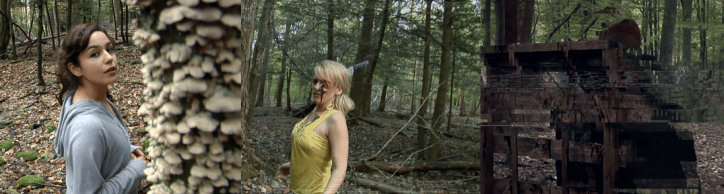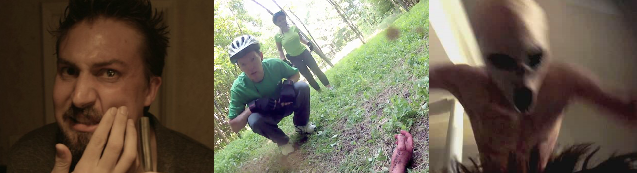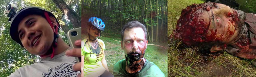 “A Ride in the Park” (Sánchez and Hale) follows keen cyclist Mike Sullivan (Saunders), who affixes a camera to his helmet and his handlebars before going for a morning cycle through the woods. Almost immediately, however, he runs across a hysterical girl (Bette Cassatt) who begs him to help her boyfriend; seeing that the poor bloke has been set upon by shambling, flesh-hungry zombies, Mike tries to escape with the girl but she pounces on him and tears a chunk out of his neck. Bleeding profusely, Mike staggers through the woods and begins vomiting the same black blood as the girl before collapsing and choking to death. When another couple of cyclists come across him, Mike reanimates and attacks the man (Dave Coyne), ripping open his cheek and then taking a bite out of his female companion (Wendy Donigian), who also becomes a zombie and joins Mike in devouring her former lover. When the male cyclist also reanimates, the three stumble through the woods and attack a child’s birthday party, biting many of the terrified guests and creating more zombies in the process. In a tragic and horrifying twist, Mike is momentarily subdued when he catches sight of his reflection and regains some small semblance of his humanity when he accidentally pocket dials his girlfriend, Amy (Devon Brookshire). Distraught at the monster he has become, Mike uses the last of his senses to shoot himself in the head with a discarded shotgun.