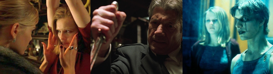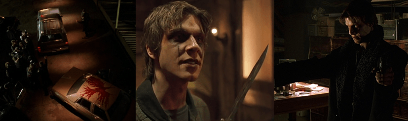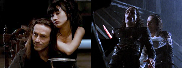 Jimmy’s up against a colourful but very confused and one-dimensional bunch. The son of a preacher killed by an “Injun”, Death has a personal vendetta against God and the church, rejecting Christianity and seeking to be the vessel for Lucifer through ritualistic sacrifice. His followers – “Famine” (Tito Ortiz), “Pestilence” (Yuji Okumoto), and “War” (Marcus Chong) – all feel wronged by the mine and the town, taking their perceived hardships and using them as an excuse to be openly racist and cause havoc. Death’s constantly accompanied by Lola Byrne (Reid), a sadistic succubus who longs for the power and infamy offered by the Devil. Having stolen a book of black magic from the head of their order, the strangely theatrical El Niño (Hopper), Lola conjures spells and incantations after gaining a vaguely defined second sight from Lily’s eyes. After tracking down and shooting Moses, the man who killed his father (Richard Cumba), Death encourages his troop to engage in wanton murder, with War gunning down eyewitnesses, all to prepare for an unholy marriage and his own physical sacrifice to be possessed by the Devil. However, as one-dimensional as these “Horsemen” are, they’re all strangely conflicted at times. Death is constantly reminding them of their motivations, calling them out when they hesitate, and even Lola appears visibly uncomfortable at Death’s wholesale slaughter of innocents. Yet, they never once defy Death’s plan, with Lola only descending into penance after her lofty ambitious are ended by the Crow. While Tara Reid continues to be far better on the eyes than the ears, being the weakest link in a chain full of rusted connections, Boreanaz has a great time hamming it up as Death and even more when possessed by Lucifer. He’s a constantly enjoyable presence here, to the point where I wish he’d been cast in the lead role and the producers had piled some more money into Dennis Hopper’s pay cheque to cast him as Death instead.