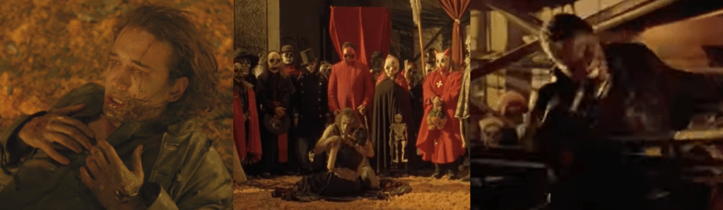 Flashbacks to Jimmy and Lily’s past are similarly limited and presented seemingly at random as a shorthand to make us care about Jimmy’s vengeance, but instead appear as subpar editing. While Emmanuelle Chriqui is certainly cute and it’s nice to spend some time with the Crow’s lover before she’s killed, she has little chemistry with Furlong, who fares far better once he’s painted up. Unfortunately, Jimmy’s Crow looks like bad cosplay, with him moping about rather than exuding the crippling anguish I’d expect from the character. He’s far better when channelling his rage, but even then he’s hampered by some poor fight scenes, with his fist fight with War being a blurry, indistinct mess made more confusing by Padre Harold, Tanner, and a bunch of armed men firing at both men. The film tries to say there are some stakes involved since Jimmy’s powers are weakened for most of its runtime, but it’s hard to believe as he shrugs off bullets and even being physically overpowered by Death, who gradually gains superhuman powers through killing and other strange rituals. Still, none of his minions present a physical challenge to Jimmy, with the terminally ill Pestilence being easily offed via electrocution and the imposing Famine simply being beaten to death with a baseball bat. Jimmy tries to channel Eric Draven’s (Brandon Lee) sombre, caring side when he heals Moses to try and atone for killing his son, but it’s a poor effort. I would’ve liked to see more time spent with Jimmy winning over Padre Harold and Tanner, especially after they save him from his crucifixion, to either better delve into the subtle themes of penance or give him some backup in storming El Niño’s brothel…church…thing. Instead, Jimmy just tells them to get out of his way and heads off alone, with Padre Harold only being convinced to believe in the Crow when Tanner vouches for him.