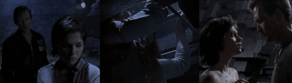 Although they’re not given a name, we are told quite a few things about the alien force that has imprisoned our main characters. They are a war-like race with little compassion and, though they can apparently understand human language and speak it through a machine, they have no understanding of concepts like “mercy”; they treat their prisoners like rats to be observed, forcibly experimented on, and dissected to learn more about their ways and their enemy. They seem oddly curious about human beings; they left Commander Hartley’s body in the cell with Brie for some time as if expecting her to do something with it (and John suspects that they eat their dead) and were fascinated by the differences between male and female bodies and sexual organs. Brie recounts with disgust and dismay how they forced her to strip down and violated her with probes and instruments, and of course she is horrified at the continued alterations being made to her body by their experiments. The aliens are depicted as huge, armoured creatures that tower over and physically dominate their captors, despite John’s best efforts to fight them back and, though we don’t see their forces in this episode, we do here many a horror story from John about how the alien’s ships have decimated humanity’s forces and proved to be a high-unconquerable enemy. And yet, despite Brie trying to encourage John to partake of the limited sustenance the aliens provide and talk him out of the futility of trying to escape or discover some weakness in their captors, John’s resolve remains absolute and steadfast His immediate focus is on learning the layout of their cell, figuring out how observed they are, and gathering as much information as he possibly can about where they are and what options are available to him, and he continually shouts defiance to his captors, taunting them with the revelation that he personally destroyed on of their capital ships and remaining adamant that they aren’t as indestructible as they immediately seem.