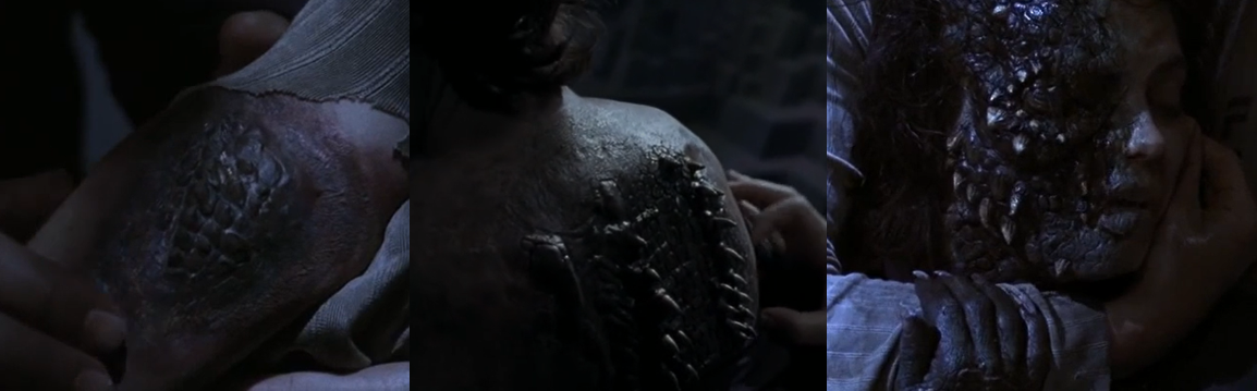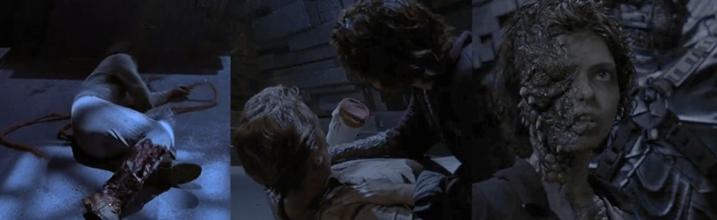 John’s determination stems from a deep-rooted need to get back into the fight because the future of humanity depends upon it; he was excited to deal a decisive blow against the enemy for the first time and to prove that they could be bested, and is angered at being captured right when he’s needed the most. John’s mindset contrasts heavily with Brie’s and both characters provide not only different perspectives on the conflict but to the world-building of this episode; John apparently embodies the single-minded, militaristic focus of those in the thick of the fight, while Brie seems very much against the war. Since John has been fighting pretty much non-stop for the last four years, he hasn’t seen what’s become of the Earth; Brie has however, and horror stories of a world turned into a police state, churning out munitions and training soldiers in a constant cycle to feed the war effort. John, however, remains adamant that humanity will come out of the war stronger than ever; he believes that the conflict will unite humankind, ending their petty squabbles and political and racial differences, to come together as one unified race. Forced into service by a standardised test and lacking John’s passion for the fight, Brie is ashamed to admit that she caved under torture and spilled everything she knew to spare herself further pain (though, as a mere cadet and a trainer, neither she nor Hartley had no information of real value) and she doesn’t share John’s fighting attitude or confidence that their enemy can be defeated. Of course, her will is only further sapped by the continual experiments and violations she suffers at the hands of their captors; the alien skin grafts cause her incredible physical pain and cannot be forcibly removed, despite John’s best efforts. Brie is taken away again and again, changing a little more each time, and her sense of identity and humanity degrade a little more each time she returns. At first, the graft is simply a leathery, reptilian wound on her arm but, soon, her entire back is converted into a sickening alien flesh and part of her face is lost to the aliens’ appalling visage.