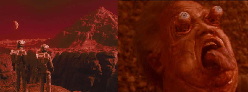 Tensions flare between Tony and Quaid once more over Eva’s death and the unexplained deaths of other mutants all across the Martian colony, which Tony is quick to pin on the Cohaagens. Quaid, however, speculates that Mars’ new atmosphere may be responsible and resists Tony’s rallying call for the rebels to take up arms against the administrators. Quaid’s pleas fall on stubborn, deaf, and frightened ears, however, and Mars is once again thrown into bloody and violent conflict, which only escalates when the Cohaagens respond by cutting off the water supply to know-rebel areas of the planet. The result is many people protest at being tarnished with the same brush, many other die, and the Mars military relentlessly hunt down and kill or arrest any rebels and mutants they come across. Quaid is, however, able to buy the rebels of Venusville time to get them to some kind of safety by pleading with one of the army’s sergeants (who know that Quaid, the muscle-bound action hero who never reloaded his gun once, was such a diplomat?) Still, Quaid is preoccupied with the continued warning about the “Martians” and heads back to the Pyramid Mines in hopes of finding some kind of answers.