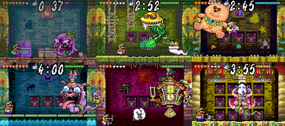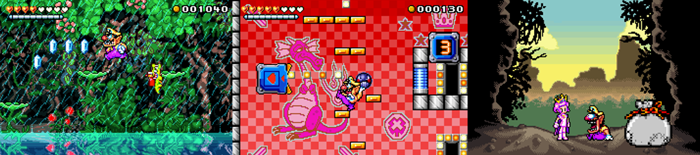 There are four Jewel Pieces in each world and each must be collected to unlock the boss doors. You must also find Keyzer or else you can’t access each subsequent world in the Passage. Every world also hides a CD, unlocking a music track for the Sound Room, and hides hidden challenge rooms where you toss about Arewo Shitain-hakase to snag extra loot. The game can be played on “Normal” or “Hard” from the start, which affects how much health you start with and even the placement of Jewel Pieces and treasure. Beating the game on “Hard” unlocks the extra challenging “S-Hard” mode, and all bosses are revived once you finish the game, allowing you to battle them again and best your time and replay previous worlds to find those missing CDs. You can waste a few hours grinding the mini games to earn extra Coins and try out the different items against the bosses, and you’ll get different endings depending on the difficulty you play and how fast you defeat the bosses, depicting Wario with more or less loot and driving different vehicles. This version of the game also allows you to rewind the action and create save states, significantly reducing the challenge and making it a bit easier to hunt for Jewel Pieces and Keyzer or undo any mistakes.