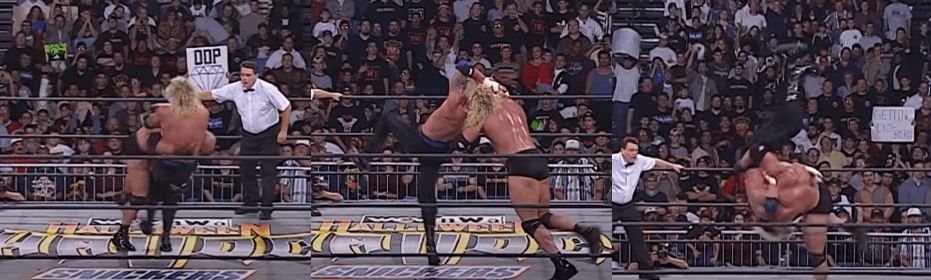 The Match: As I’ve detailed before, I wasn’t lucky enough to grow up watching WCW or WWF; I wasn’t able to get into wrestling until early-2000, and by then all I could really watch were WWF pay-per-views, so my knowledge of WCW was limited to magazines and videogames. Still, competitors like Goldberg and DDP definitely stuck out for me, primarily because they had a lot of media attention and featured in one of my first real experiences of WCW, the ill-fatedReady to Rumble (Robbins, 2000). I didn’t really get to see DDP in action until he was inexplicably cast as the Undertaker’s sadistic stalker during the botched “Invasion” angle, a decision which meant DDP’s WWF and World Wrestling Entertainment (WWE) career never reached the heights of his WCW fame. Similarly, I wouldn’t get to see Goldberg in action until he arrived in WWE in 2003 for a lacklustre run that saw him put on one of the worst performances in wrestling history, and later further tarnish his reputation with a series of questionable performances following his Hall of Fame induction. Still, I’m always excited to watch WCW biggest stars perform at the height of their career and popularity and to see them booked correctly, especially as this is considered one of the best matches in either man’s career. There was a moment of trepidation as the bell rang; at this point, Goldberg has amassed a winning streak of 154 and his matches were short, sharp affairs that played to his strengths as a powerhouse. DDP, meanwhile, was more of a technician and a wily competitor, though neither man backed down or showed any fear; this was undoubtedly a match with high stakes for both since it meant a championship reign for DDP and another feather in the cap of WCW’s brutish superstar. After a spot of jaw-jacking, the two men locked up, with DDP being easily overpowered in the early going; Goldberg repeatedly tossed him into the far corner with little effort and DDP, realising that tenacity alone wouldn’t win the day, changed tactics, stalling for time and then took the big man down with an arm drag before goading him into charging the two of them through the ropes and to the outside.