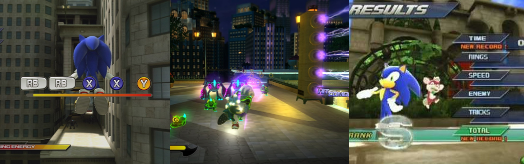 As is the standard for Sonic titles, Sonic is protected from damage by Golden Rings. This time around, when Sonic is hurt, he won’t lose all of his Rings and, when playing as the Werehog, you have a more traditional health bar that is replenish by the Rings. Collecting one-hundred Rings awards you with an extra life, which you will also find scattered here and there around stages (usually right before a dangerous area), and you pass through checkpoints to allow you to continue from later in the stage should you die. Deaths can be quite frequent as Sonic gets a bit slippery at times and it’s pretty easy to blast off out of bounds or over the edge and to your death, and you can also fall to your death in hub worlds! When you complete a stage, though, you’ll be given a grade based on how fast you finished and how any tricks you performed as Sonic (by jumping through special hoops and performing QTEs), among other things. This, and defeating enemies, will provide you with experience points (EXP) that you can use to power-up Sonic’s base speed and Ring Energy, and the Werehog’s strength, Unleash Meter, maximum life, and learn new combos and attacks.