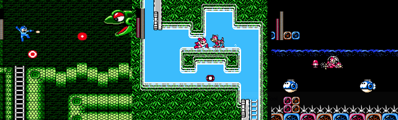 Mega Man 3 is much bigger than its predecessors, and therefore much tougher as a result. Ladders, tricky platforming, insta-kill hazards like spikes and bottomless pits, and disappearing/reappearing blocks are commonplace, often over huge gaps. Turrets also crop up a lot, as do tunnels for you to slide through (sometimes with the risk of a drill hazard), and some stages feature a lightbulb enemy that blankets the environment in darkness until they’re destroyed. Some stages have more unique elements built into them; Magnet Man’s stage, for example, incorporates a magnetic gimmick where turbines attract you, causing no damage but putting your jumps at risk. Spark Man’s stage includes a moving electrical hazard that forces you to time your jumps to avoid damage (or a drop down a pit) and rising blocks over a bottomless pit with insta-kill ceiling spikes above, and Snake Man’s stage includes giant snake head turrets that spit massive fireballs and make the ground uneven until they’re destroyed. Gemini Man’s stage features underwater sections where your jump is much higher and your progress is blocked by destructible Pole eggs that spawn in Pole enemies when destroyed. Often, you’re tasked with making tricky jumps to small or moving platforms, usually while enemies or projectiles rain down. Sometimes these platforms are temporary, sometimes they’re moving, and sometimes you’ll need to make your own using Rush’s abilities. Four of the stages are remixed into harder challenges once you’ve defeated the eight Robot Masters, adding small cogs to Spark Man’s stage, upping Rush Coil’s use in Needle Man’s stage, increasing the spikes and Pole eggs in Gemini Man’s stage, and adding more spiked shafts to Shadow Man’s stage.